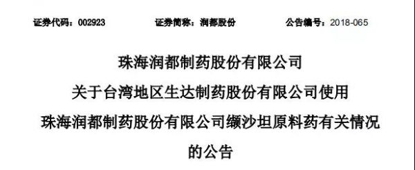 8月4日,润都制药发布公告表示,台湾地区生达化学制药将其供应的缬沙坦原料药送第三方单位检验,检出极微量 N—亚硝基二甲胺(NDMA)成分;最终检验结果含量极微,生达制药决定自主预防性下架回收含有该成分的四项药品,并且暂时停止上述药品生产。