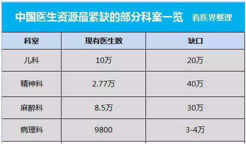 统计显示,儿科医生缺口高达20万,麻醉医生缺口高达30万,病理科医生缺口也是现有数量的好几倍,此外急诊、康复等科室医生及专业技术人员也都非常的紧缺。