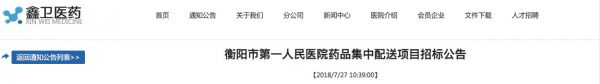 近日,湖南省衡阳市第一人民医院在第三方药品招采平台,发布一则药品集中配送项目招标公告,报名时间为7月27日9时至8月13日17时。