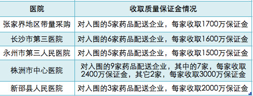 而据湖南省药品流通行业协会透露,近些年来,湖南省一些公立医疗机构在遴选药品配送企业时,收取数额巨大的的质量保证金,是非常普遍的现象。从地区带量采购,到三甲医院,甚至县级医院,都是如此。(部分情况见下表)