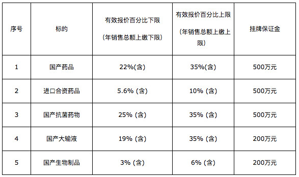公告要求,将根据药品当年销售总额,按照药品类别设定了不同的“有效报价百分比”。5个类别报价百分比的下限分别为3%~25%,上限分别为6%~35%。此外,还需缴纳高额的挂牌保证金。(见下表)