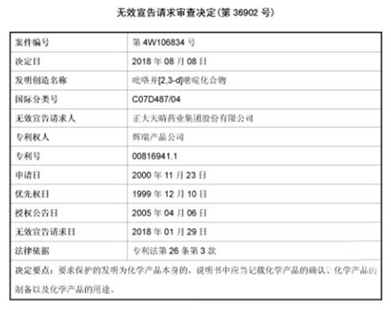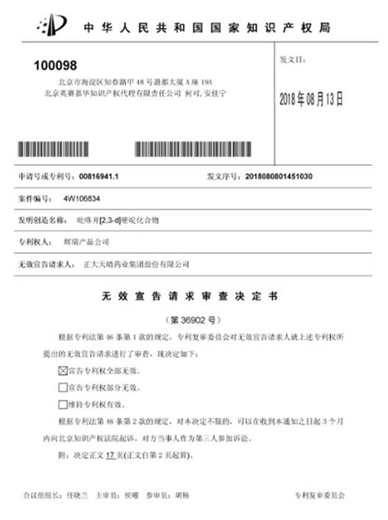 正如我们在《无效宣告请求审查决定书》中看到的那样,作为无效宣告请求人,辉瑞的JAK抑制剂托法替布核心专利-化合物专利全部无效,正大天晴得益良多。