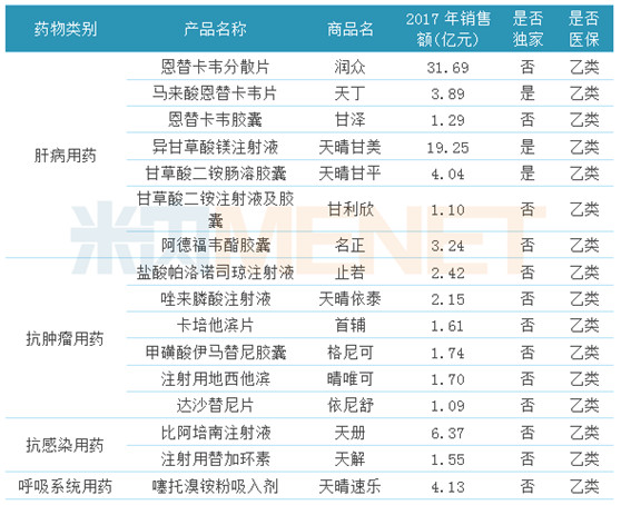 在这16个过亿产品中,肝病用药有7个,抗肿瘤用药有6个,抗感染用药有2个,呼吸系统用药有1个。7个肝病用药中,有3个是正大天晴药业的独家产品,有2个产品销售额超过10亿元,可见肝病领域是公司的主导领域;6个抗肿瘤用药中,注射用地西他滨、甲磺酸伊马替尼胶囊、达沙替尼片均为国内首仿产品,这也奠定了其“首仿之王”的地位。