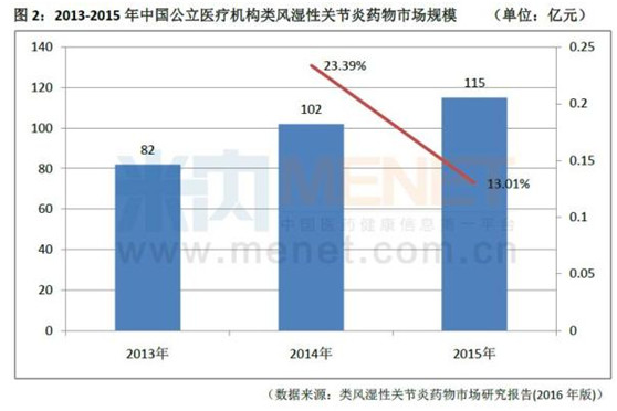 与此同时,米内网数据显示,2015年中国城市公立医院、县级公立医院、城市社区中心以及乡镇卫生院(简称“中国公立医疗机构”)类风湿性关节炎药物市场规模超过了115亿元。