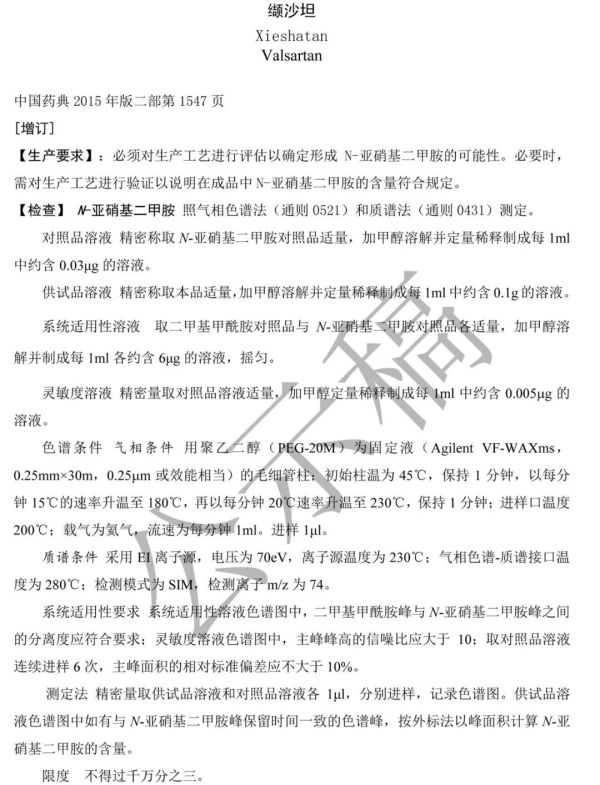 8月20日上午,国家药品监督管理局官网转发药典委《关于缬沙坦国家标准修订稿的公示》,面向行业公开征求意见,公示期自上网之日起一个月。公示稿拟对临床治疗高血压药物缬沙坦片、缬沙坦胶囊的原料药缬沙坦的国家标准进行修订。《医药经济报》记者注意到,该公示稿虽修改内容并不算多,但在2015版中国药典标准的基础上,重点从“生产要求”以及“检查”两个方面增订了N-亚硝基二甲胺(简称NDMA)的评估内容。