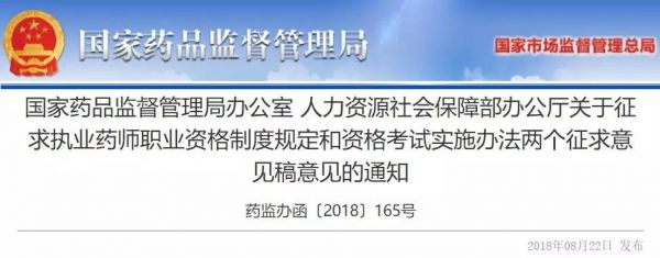 8月22日,国家药监局、人社部联合发布《关于征求执业药师职业资格制度规定和资格考试实施办法两个征求意见稿意见的通知》。