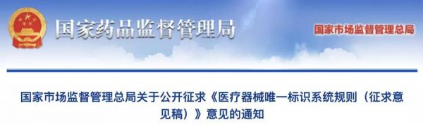 8月22日,国家市场监督管理总局发布关于公开征求《医疗器械唯一标识系统规则(征求意见稿)》意见的通知,旨在加强医疗器械研制、生产、经营和使用环节的监督和管理,提高监督管理效能。