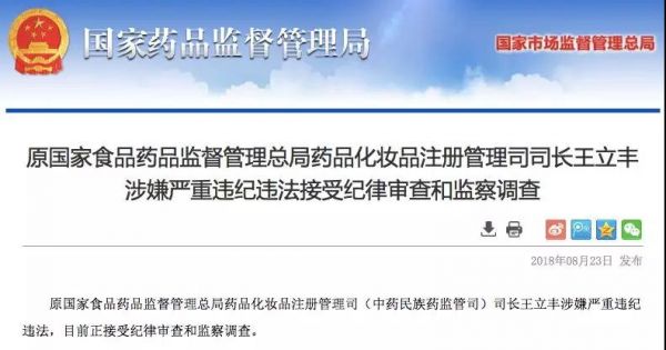 8月23日,国家药监局官网发布消息,原国家食品药品监督管理总局药品化妆品注册管理司(中药民族药监管司)司长王立丰涉嫌严重违纪违法,目前正接受纪律审查和监察调查。