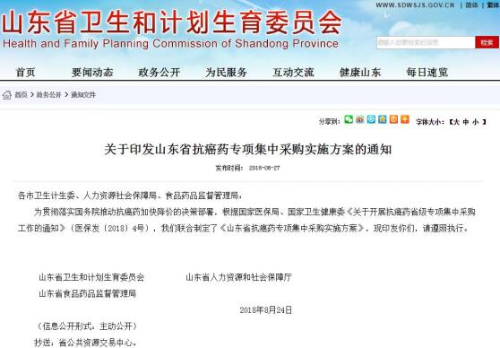 8月24日,山东省卫生和计划生育委员会、山东省人力资源和社会保障厅、山东省食品药品监督管理局联合印发《关于印发山东省抗癌药专项集中采购实施方案的通知》。根据《通知》发布的《山东省抗癌药专项集中采购实施方案》,山东省公共资源交易中心组织药品国内药品生产企业和进口药品国内总代理商按要求自愿提交申报材料,根据企业申报数量、药品类别采取竞争报价、带量谈判、直接挂网等方式,实行分类采购。采购周期原则上为1年。