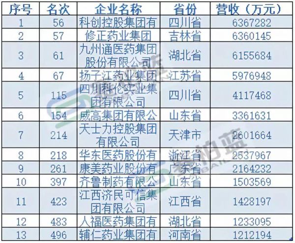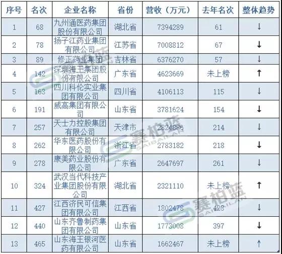 与此同时,填补进榜单的医药企业分别为深圳海王集团股份有限公司(142名)、武汉当代科技产业集团股份有限公司(324名)、山东海王银河医药有限公司(465名)。