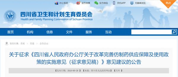 昨日(8月29日),四川省人民政府办公厅关于改革完善仿制药供应保障及使用政策的实施意见(征求意见稿)。