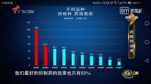此前,《财经郎眼》频道援引了上海医工院的数据,医工院对比了不同品种扶他林的药效差距,其结论是最好的仿制药的效果也只有原研药的53%。