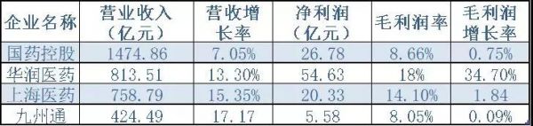 华润医药、上海医药和九州通的营收分别为813亿元、758亿元和424亿元,营增长率都为两位数。