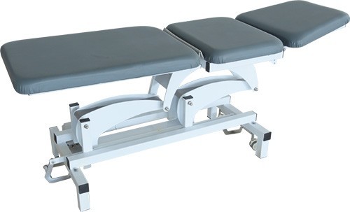 多体位治疗床可根据治疗需要调节不同的仰、卧体位.三折的卧位调节,方便对颈、胸、腰椎及下肢病患者的不同屈伸体位的治疗;可调的俯卧位选择,可为一些肺部相关疾病患者提供有效、便捷的引流体位,并增加舒适感;双下肢分离可调,使患者单个下肢可独立地置于各种治疗及放松体位,此设计在坐位时可有效提供靠背作用;脚控高度控制装置及不同体位调节,可最大限度降低治疗师的工作强度,确保治疗效果和效率。