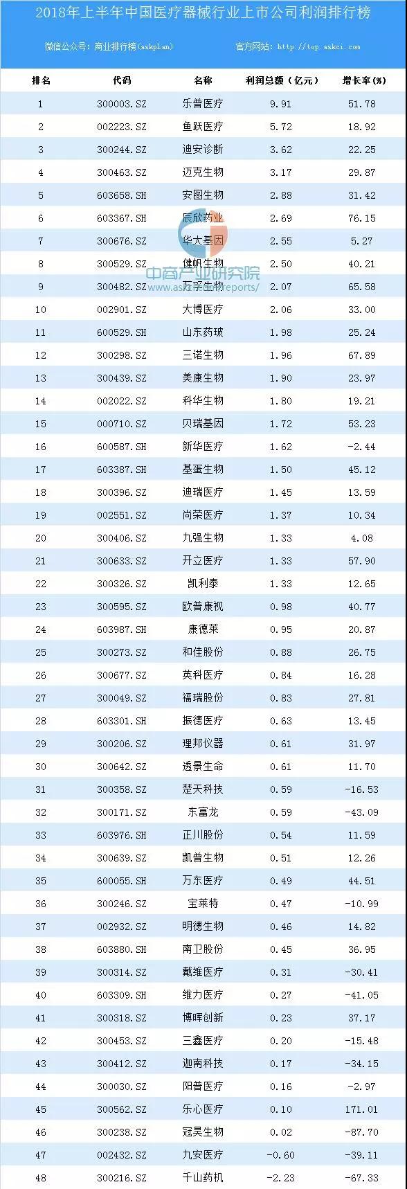 排名前十的医疗器械行业上市公司为乐普医疗、鱼跃医疗、迪安诊断、迈克生物、安图生物、辰欣药业、华大基因、健帆生物、万孚生物和大博医疗。其中这10家上市公司的总利润为37.16亿元。