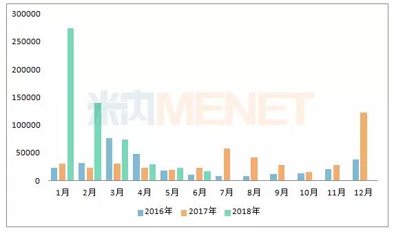 图1:2016-2018年同期全国流行性感冒发病数(单位:例)