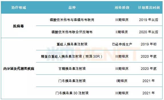 在内分泌及代谢类疾病领域重点开发胰岛素全系列产品,涵盖第二代和第三代胰岛素,精蛋白重组人胰岛素注射液(预混30R)、甘精胰岛素注射液已经进入Ⅲ期临床,预计2020年底获批上市,此外,门冬胰岛素30注射液也已经入Ⅲ期临床,门冬胰岛素注射液已经进入Ⅰ期临床,两个产品预计2021年获批上市。