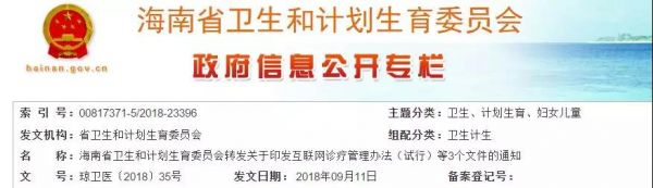 9月11日,海南卫计委在官网转发国家卫健委、国家中医药管理局发布的《关于印发互联网诊疗管理办法(试行)等3个文件的通知 》(国卫医发〔2018〕25号)文件。