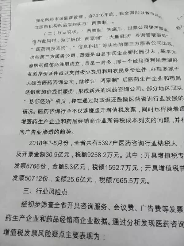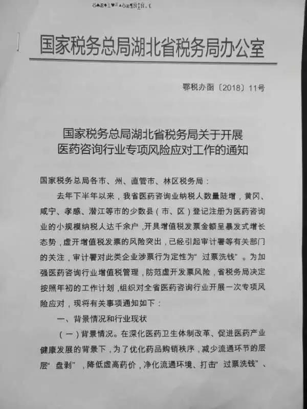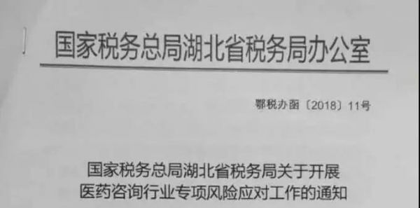 近日,业内流传一份国家税务总局湖北省税务局发布的《关于开展医药咨询行业专项风险应对工作的通知》(以下简称《通知》)。(原文件见附件)