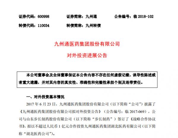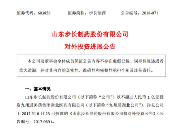 昨日(9月14日,)步长制药和九州通先后发布了《对外投资进展公告》。