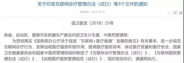 9月14日,卫健委发布了《关于印发互联网诊疗管理办法(试行)等3个文件的通知》,一起发布了《互联网诊疗管理办法(试行)》、《互联网医院管理办法(试行)》、《远程医疗服务管理规范(试行)》三个文件,这些文件均与互联网医疗有关。