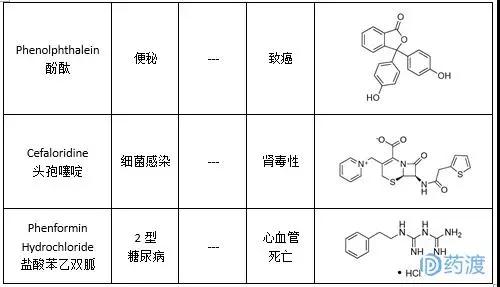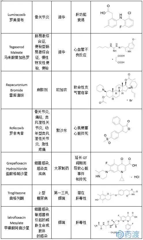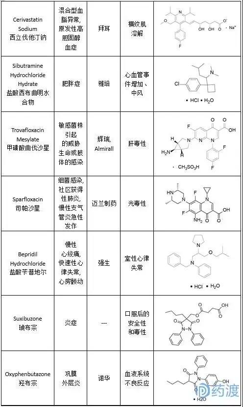 通过查询数据库、文献,如上所述,笔者共查到近142个化学药物已撤市,撤市原因主要集中于安全性问题及同类竞品竞争;其中,因安全性问题撤市药物共49个,详细情况见下表(附带结构)。