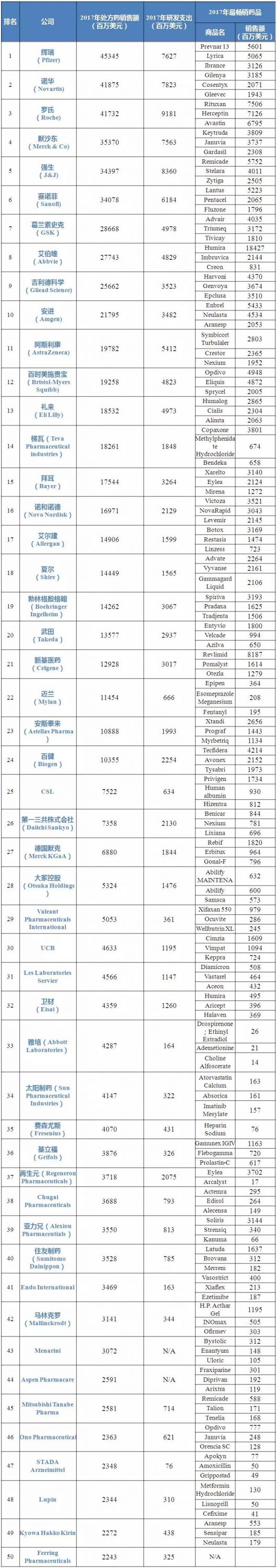 尽管在创新研发、市场准入、产品定价和商业推广上,生物制药和医疗市场近年都发生诸多重大变化,但由制药经理人(Pharma Exec)发布的全球生物制药销售额前50名企业年度榜单总是保持相对稳定。今年的榜单中,排名前10位的公司再次以辉瑞(Pfizer)为首,其他企业位序仅存在小幅变动。前十公司的处方药销售额平均增幅相对平缓,其中艾伯维(Abbvie)和强生(Johnson & Johnson)增幅最大,分别为9.7%和8.6%。