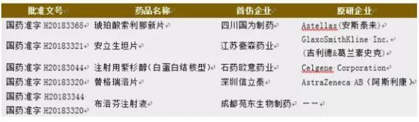 表1. 目前2018年国内批准上市首仿品种(不含注册分类6)