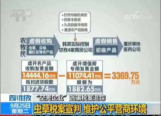 之后,虫草税案的犯罪嫌疑人韩某交代了事实:其在甘孜州注册了四家农产品收购公司,主要是为了虚开增值税专用发票,医药公司的资金,按提成收入3%扣除后,韩某将剩余资金转给沈某指定的账户上,公司没有实际的业务往来。