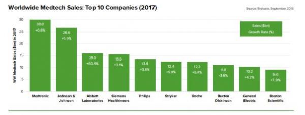 2017年美国的美敦力(Medtronic)仍然占据榜首的位置,销售额高达300亿美元,市场占有率为7.4%;雅培(Abbott Laboratories)2017年销售额增长了60.9%, 这主要是由于其在年初并购了 St. Jude Medica,这使其一跃升为全球第三大医疗器械公司;而美国的BD公司(Becton Dickinson)是TOP20中唯一一个在过去12个月中出现负增长的公司,主要是由于其呼吸领域业务的剥离。