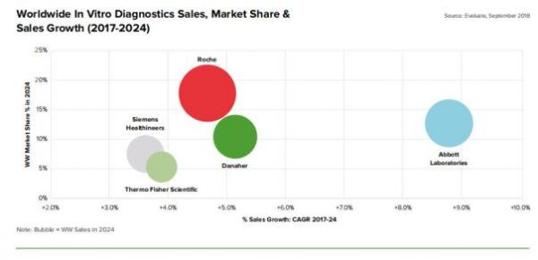 Evaluate Medtech预计,到2024年,罗氏依然在体外诊断市场占据最大的份额,市占率约17.8%。而随着收购Alere成功,雅培有望坐上体外诊断的第二把交椅,销售额将超过100亿美元。排名第三的Danaher将依然持续在此领域有大的作为,今年3月,Danaher以20亿美元对IntegratedDNA Technologies 发起了收购。