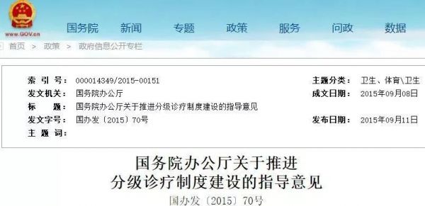 在2015年9月11日,国办发布的《关于推进分级诊疗制度建设的指导意见国办发〔2015〕70号》中,明确了各级各类医疗机构诊疗服务的功能定位。