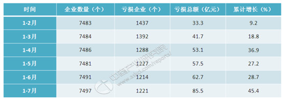 据9月初中商产业研究院数据显示:截止2018年7月底,我国医药行业规模以上企业数量达到7497家,其中亏损企业数量1221家,亏损面16.3%,较上个月提高了0.1个百分点,2018年前7个月医药行业亏损总额85.5亿元,累计同比增长45.4%。