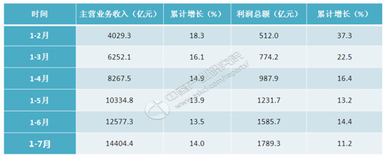 医药工业运行数据显示,2018年1-7月,我国医药行业主营业务收入达14404.4亿元,累计同比增长14%,比1-6月上升了0.5个百分点,行业实现利润总额达1789.3亿元,累计同比增长11.2%,比1-6月下降了3.2个百分点。