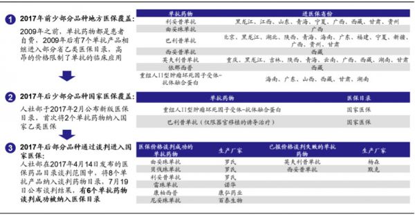 医保覆盖程度增加,提高了患者的购买力。我国的单抗药物从最初完全自费,经历了部分品种地方医保覆盖、国家医保覆盖、国家医保谈判进入医保的过程。