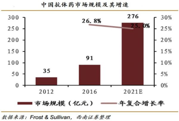 其中,抗体药作为生物药的新兴细分小类,将会迎来迅猛的发展。Frost&Sullivan报告显示,中国单克隆抗体的市场规模由2012年的35亿元人民币增至2016年的91亿元人民币,年复合增长率为26.8%。估计2016年至2021年将以年均增长25.0%的速度增长,预计于2021年达到276亿元。