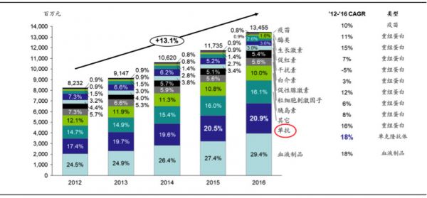 在医疗保健支出增加、研发能力增强、政府政策积极变革及资本投资增加的推动下,中国生物品市场正处于快速发展阶段。主要由于生物制品大多为疗效较好的靶向药,如其中单克隆抗体近些年发展势头迅猛。