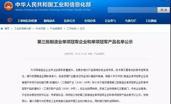 据了解,为引导制造业企业专注创新和质量提升,在更多细分产品领域形成全球市场、技术等方面领先的单项冠军地位,提升我国制造业国际竞争力,促进我国产业整体迈向全球价值链中高端,工信部经企业自愿申报,主管部门、中央企业推荐,行业协会限定性条件论证、专家组论证,现将拟公布的第三批制造业单项冠军企业和单项冠军产品名单予以公示,公示时间至10月15日。
