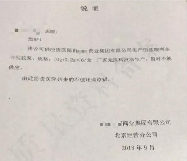 近日,一则商业公司发给医院的断货说明在业内流传。通知显示,断货的药品为盐酸利多卡因胶浆,断货原因是厂家无原料,无法生产。