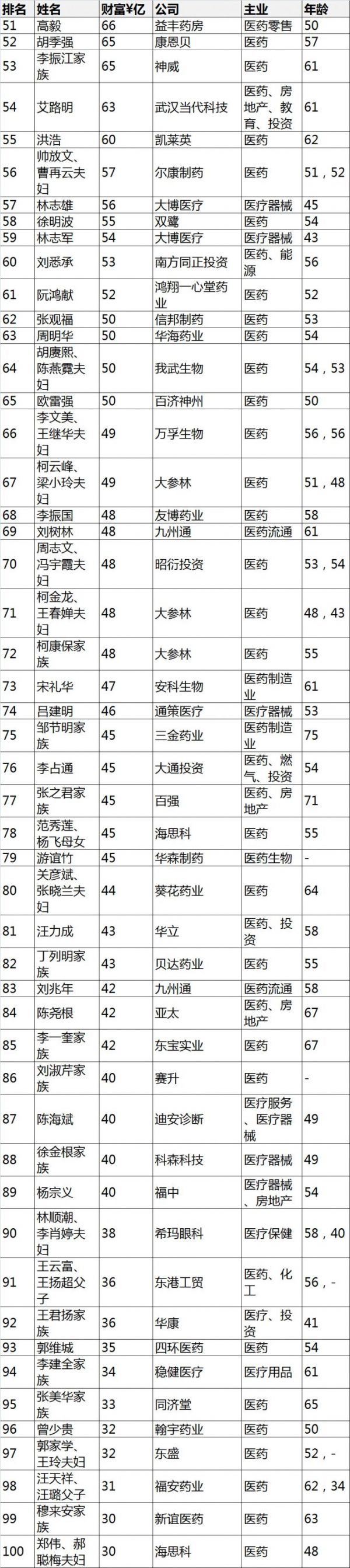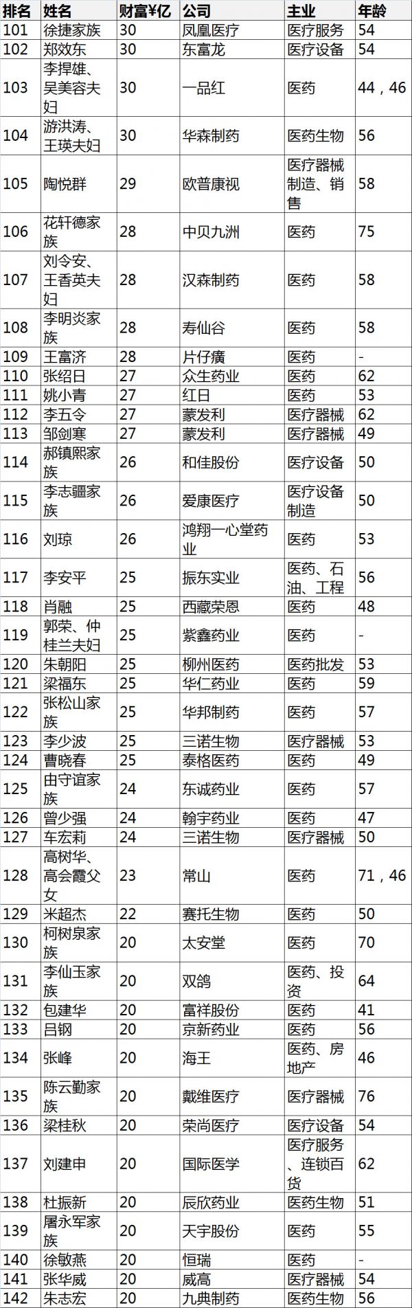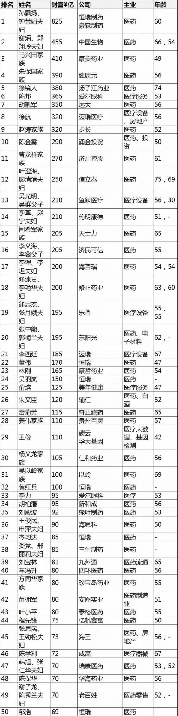 中国医疗行业共有140余家企业老总上榜。恒瑞制药孙飘扬、中国生物谢炳、康美药业马兴田位列前三名。医疗器械制造商迈瑞医疗徐航和鱼跃医疗吴光明也居前列。