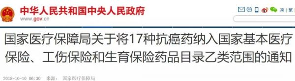 10月10日,中国政府网发布《国家医疗保障局关于将17种抗癌药纳入国家基本医疗保险、工伤保险和生育保险药品目录乙类范围的通知(医保发〔2018〕17号)》(下称《通知》)。