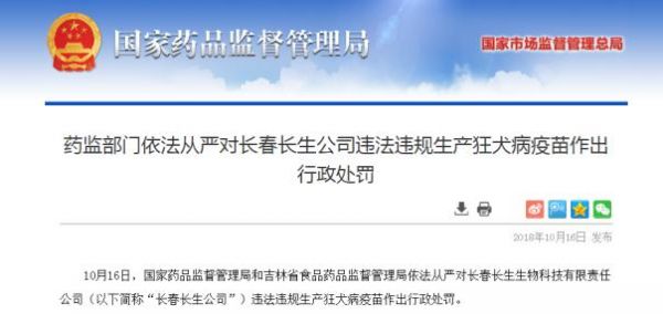 16日,国家药监局和吉林省食药监局分别对长春长生公司作出多项行政处罚。国家药监局撤销长春长生公司狂犬病疫苗(国药准字S20120016)药品批准证明文件;撤销涉案产品生物制品批签发合格证,并处罚款1203万元。吉林省食药监局吊销其《药品生产许可证》;没收违法生产的疫苗、违法所得18.9亿元,处违法生产、销售货值金额三倍罚款72.1亿元,罚没款共计91亿元;对涉案的高俊芳等14名直接负责的主管人员和其他直接责任人员作出依法不得从事药品生产经营活动的行政处罚。涉嫌犯罪的,由司法机关依法追究刑事责任。