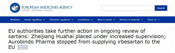 公告中显示,欧盟当局正在加强对中国公司浙江华海的监管,并禁止在欧盟药品中使用其缬沙坦。