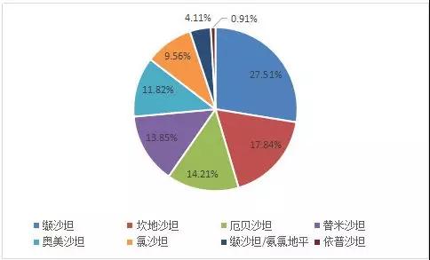 其中,缬沙坦、坎地沙坦、厄贝沙坦、氯沙坦和奥美沙坦共占据沙坦类药物近81%的市场份额。
