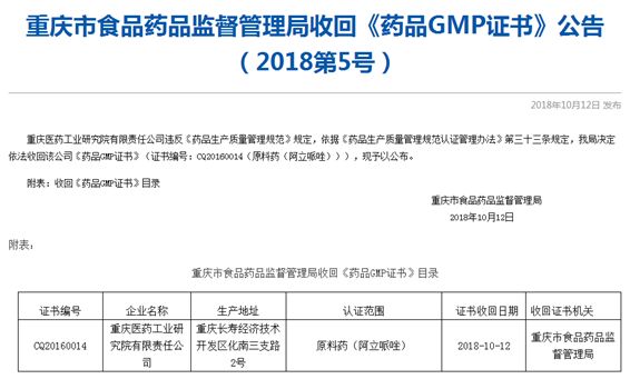 近期,华海药业的缬沙坦事件闹得沸沸扬扬,国庆节后一周,股价连续跌停,作为国内原料药及制剂出口的龙头企业之一,该事件备受业内关注。然而,日前又一个原料药“出事”了。重庆市食药监局发布《行政处罚决定书》((渝)药罚[2018]39号)和收回《药品GMP证书》(2018第5号)公告,重庆市食药监局给予重庆医药工业研究院有限责任公司(简称:重庆医工院)警告处罚,并收回其阿立哌唑原料药《药品GMP证书》。据资料显示,重庆医工院的背后由复星医药和重药控股两家A股上市药企持股。