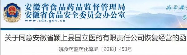 同日(29号),安徽食药监局发布《关于同意安徽省颍上县国立医药有限责任公司恢复经营的函》。
