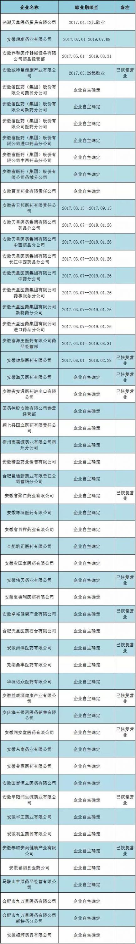 以及安徽阜阳润生源药业、安徽威特曼健康产业有限公司、安徽同安堂医药有限公司、安徽省聚仁药业有限公司、安徽健华医药有限公司、安徽伟天药业有限公司、安徽海天医药有限公司等12家药企已申请恢复经营。