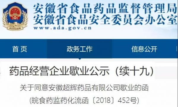 10月29日,安徽省食药监局发布《药品经营企业歇业公示(续十九)——关于同意安徽超辉药品有限公司歇业的函》。