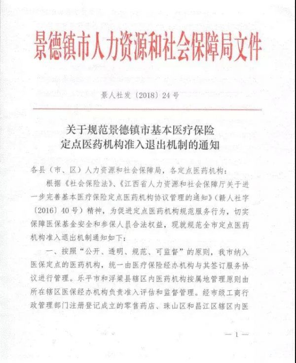 10月29日,江西省景德镇市人社局发布《关于规范景德镇市基本医疗保险定点医药机构准入退出机制的通知》(以下简称通知),通知自下发日执行。