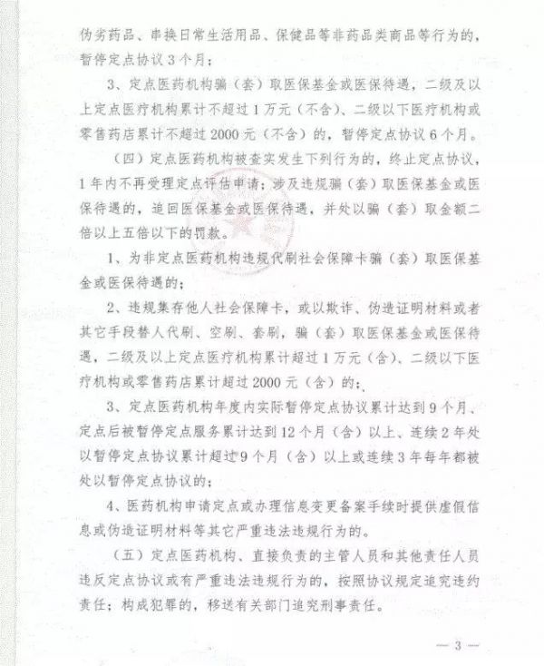 其中提到,定点医药机构年度内实际暂停定点协议累计达到9个月、定点后被暂停定点服务累计达到12个月(含)以上、连续2年处以暂停定点协议累计超过9个月(含)以上或连续3年每年都被处于暂停定点协议的。